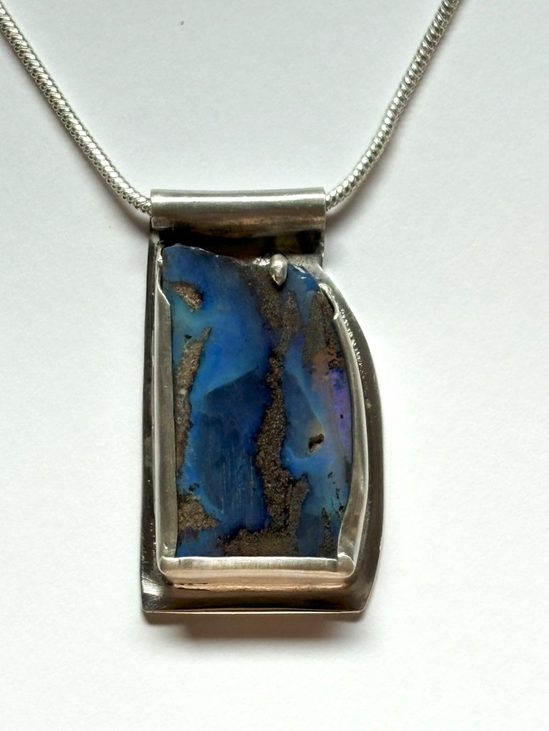 A bolder opal from Queensland Australia is the center piece of this design. The various hues of blue and brown create an impression of flowing water. The setting is an open bezel to showcase the natural edge of the stone which is secured with a single prong that tops the river-like design in the stone. Set in sterling silver. Approx 1.5″ long and approx 1″ wide. Price is $225 -sold