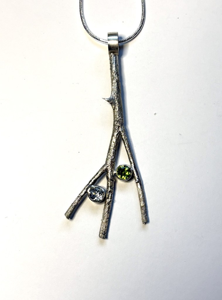 The peridot in this piece represents a rose leaf. The white topaz with it’s oval setting are reminiscent of a dew drop. The sterling silver setting was created from a rose branch, thorns included, using the lost-was method of casting where the twig is burnt out inside a plaster mold and the silver forced into the void. A silver chain is included. Price is $180, purchase via Square using this link: Purchase Rose Dew Drop