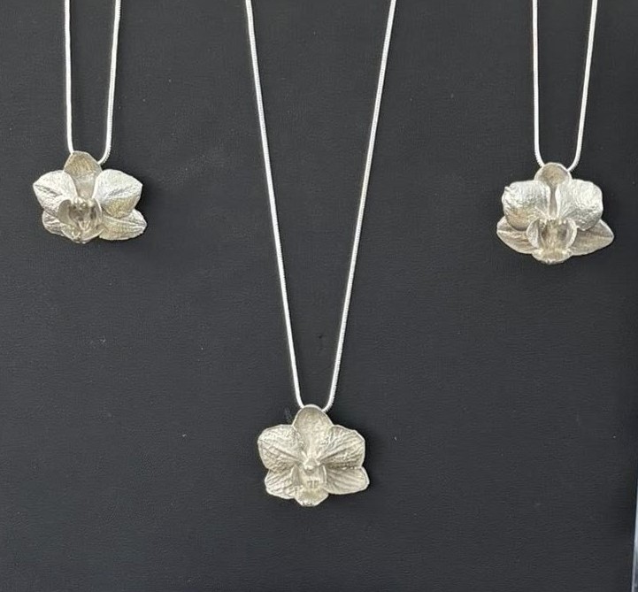 This is an example of a phalenopsis orchid that was embedded in plaster, burnt out for over 5 hours, leaving a void in the plaster. The void was filled with molten, sterling silver. The mold is then destroyed to reveal the “cast”. Purchase one of our sterling orchids, complete with a sterling chain for $74. We’ll send a unique cast that is approximately 1.5 inches wide and with .4 to 0.8 grams of sterling silver. Satisfaction is guaranteed- we can email you a copy of the exact piece at your request (lisa@trinkets4u.com). . Purchase via Square using this link: