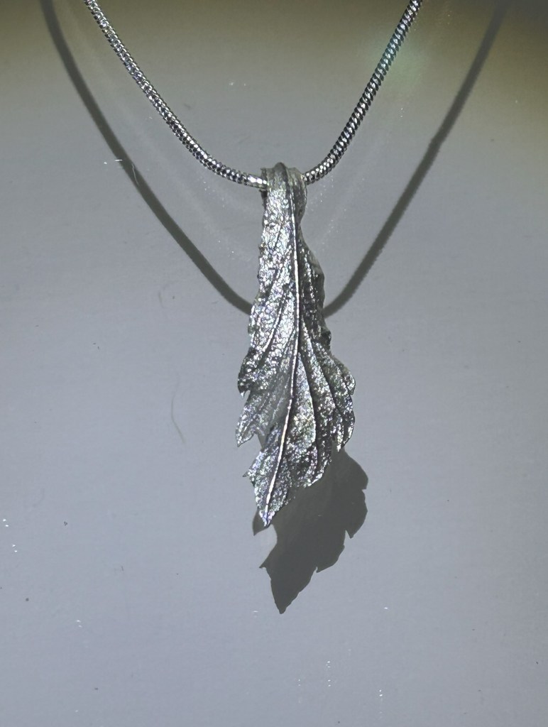 This is an example of a sage leaf that was embedded in plaster, burnt out for over 5 hours, leaving a void in the plaster. The void was filled with molten, sterling silver. The mold is then destroyed to reveal the “cast”. Purchase one of our sterling sage leaves, complete with a sterling chain for $44. We’ll send a unique cast between 1.25 and 2.5″ long. Satisfaction is guaranteed- we can email you a copy of the exact piece at your request (lisa@trinkets4u.com). Purchase via square using this link: Sage Leaf